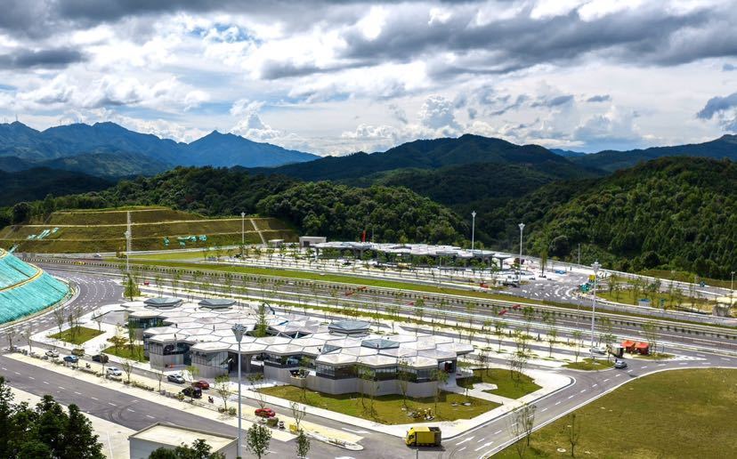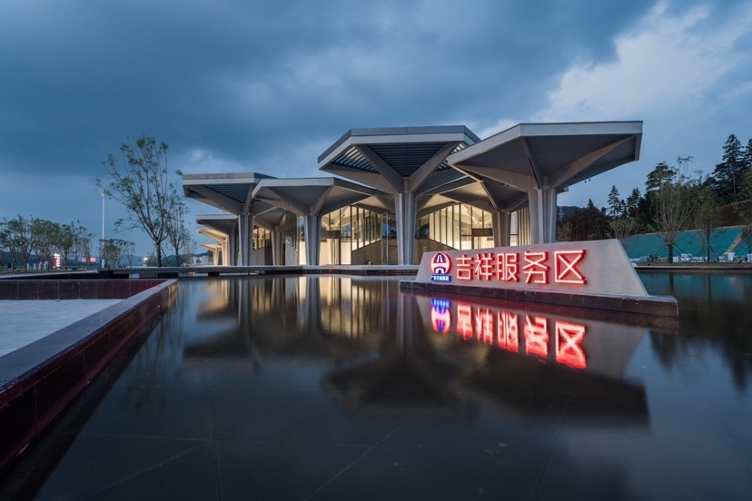 鸟瞰吉祥服务区。这样的设计,不仅兼具了简约美学与现代设计感,其93%的整体装配率,还具有标准化、高装配率、流动空间、自遮阳体系等特色,充分体现了项目“绿色、环保、低碳”的设计与建设理念。