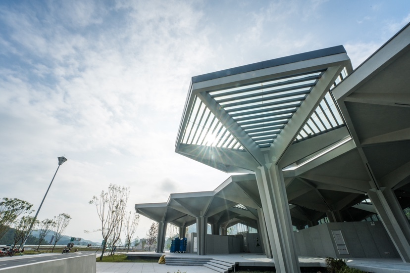 吉祥服务区主体建筑采用“清水混凝土+装配式建筑”工艺,以六边形清水混凝土构件伞为建筑构成单位,单个构件看起来像混凝土浇筑的一把“伞”,高空俯瞰这把伞就是一朵“三角梅”。