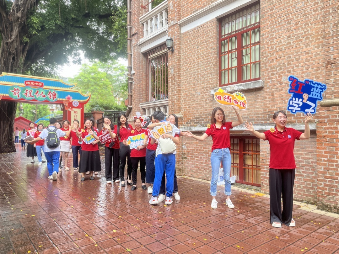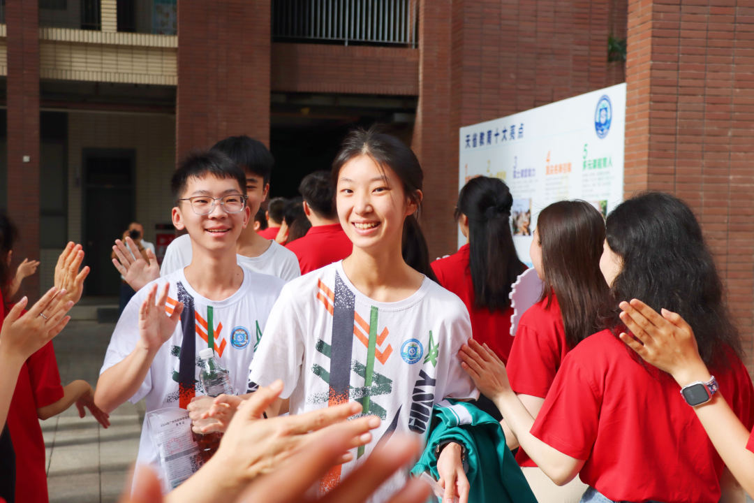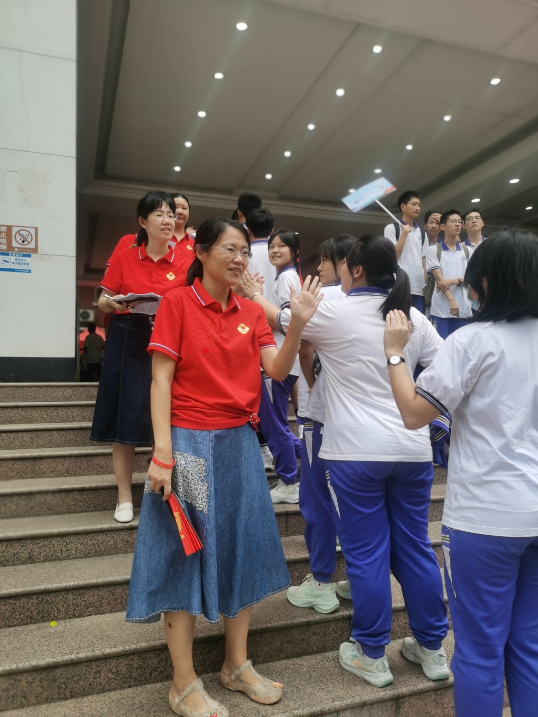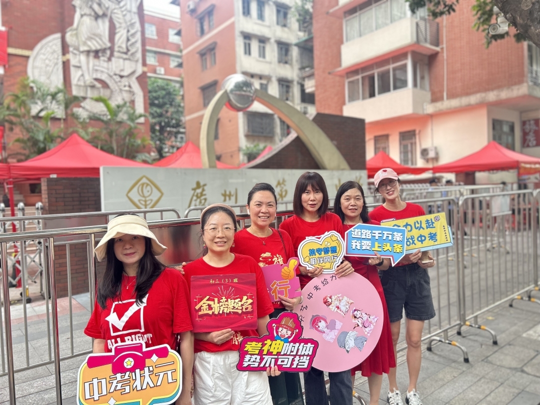 广州市培正中学考点外,家长聂先生带了一长一短两条甘蔗来送考,一是祝愿孩子“掂过碌蔗”,二是用一长一短的甘蔗组成一个对勾形状,祝福孩子“答的都对”。他希望孩子放平心态,正常发挥,“虽然中考是一场重要的考试,但不能代表以后的一切,不要对中考有过重的心理负担,平常心对待。”培正中学的老师们则身穿红色T恤,肩上别着定制版向日葵,在校门口列队与考生击掌鼓劲。