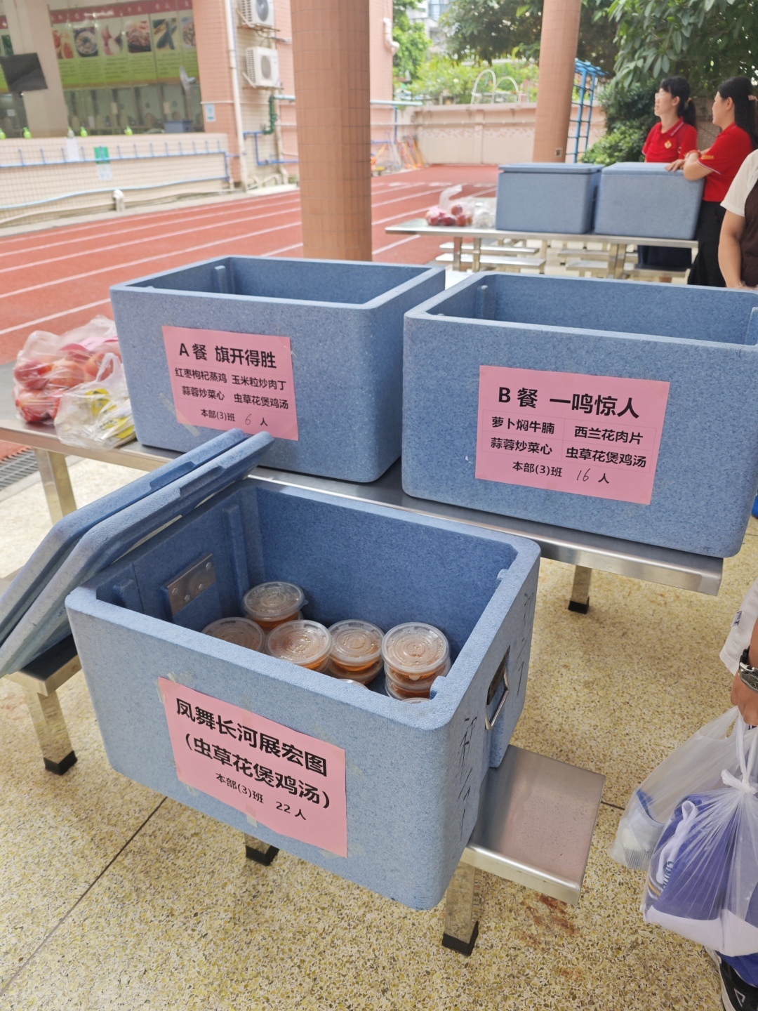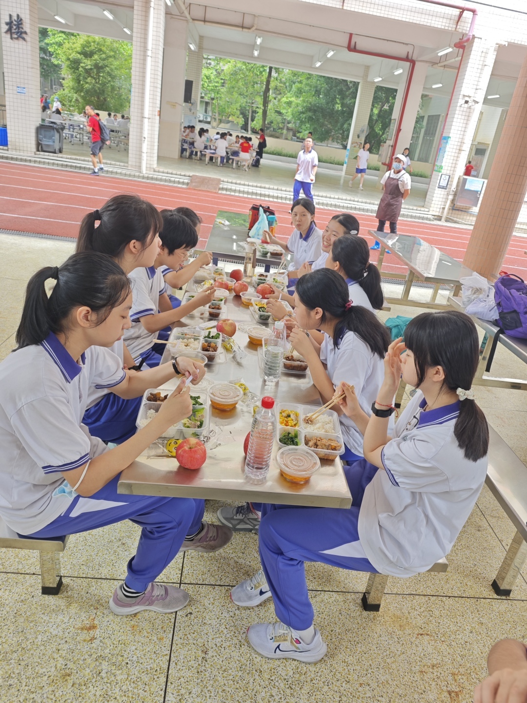 考生们在考场内奋力拼搏的同时,考场外的家长和学校教职工用心用情护航考生们圆梦。“中考路上不孤单,我们一起为你们‘打CALL’!”广州市第十六中学的家长为考生们精心准备了打气横幅。十六中则准备了分别寓意“旗开得胜”“一鸣惊人”的美味午餐,还有寓意“凤舞长河展宏图”的虫草花煲鸡汤,供考生选择。同学们围坐在一起轻松愉快地进餐,谈笑风生。