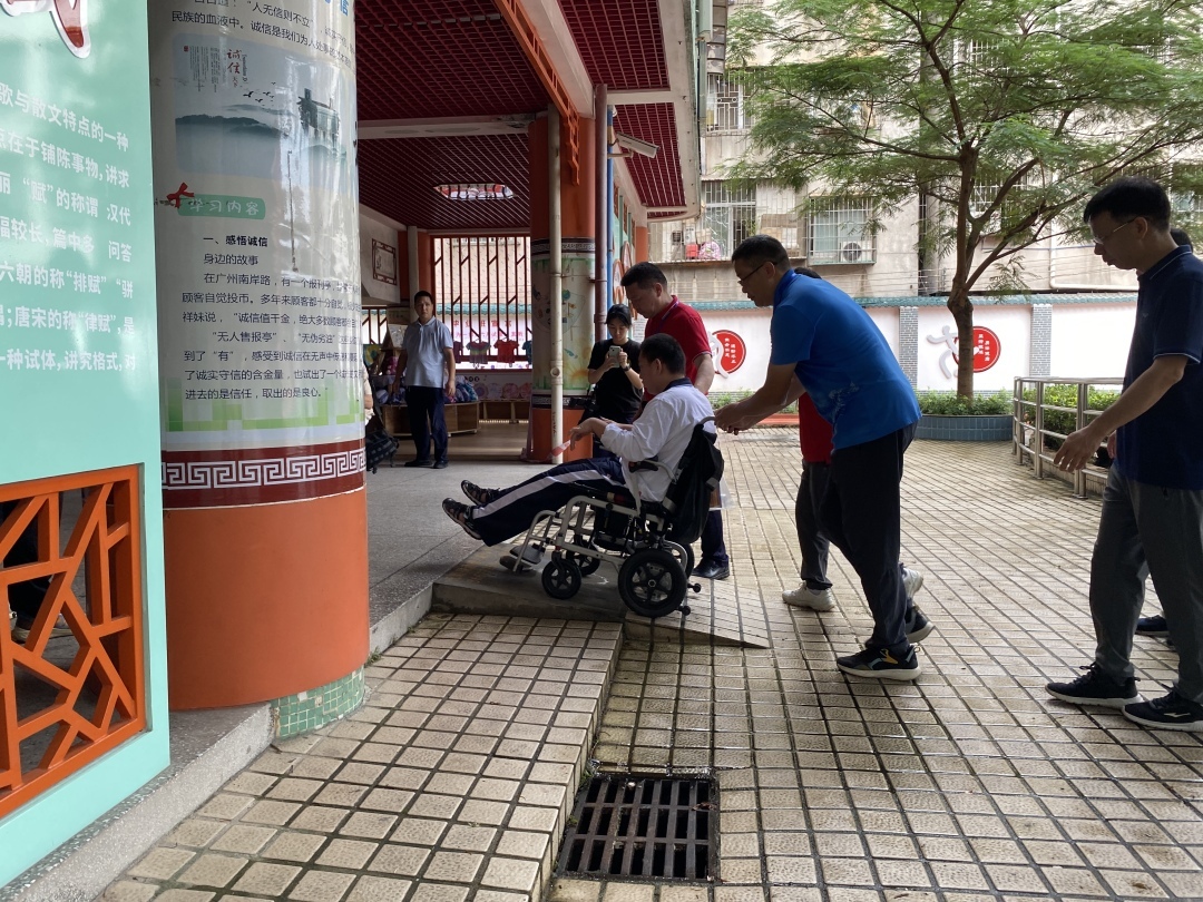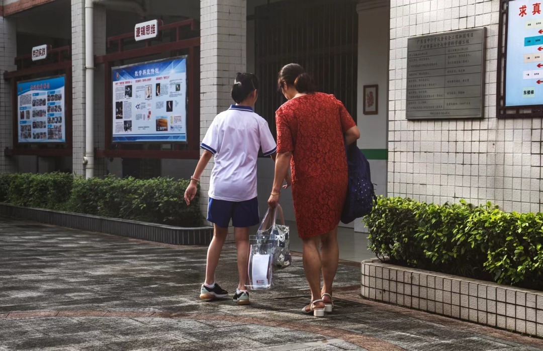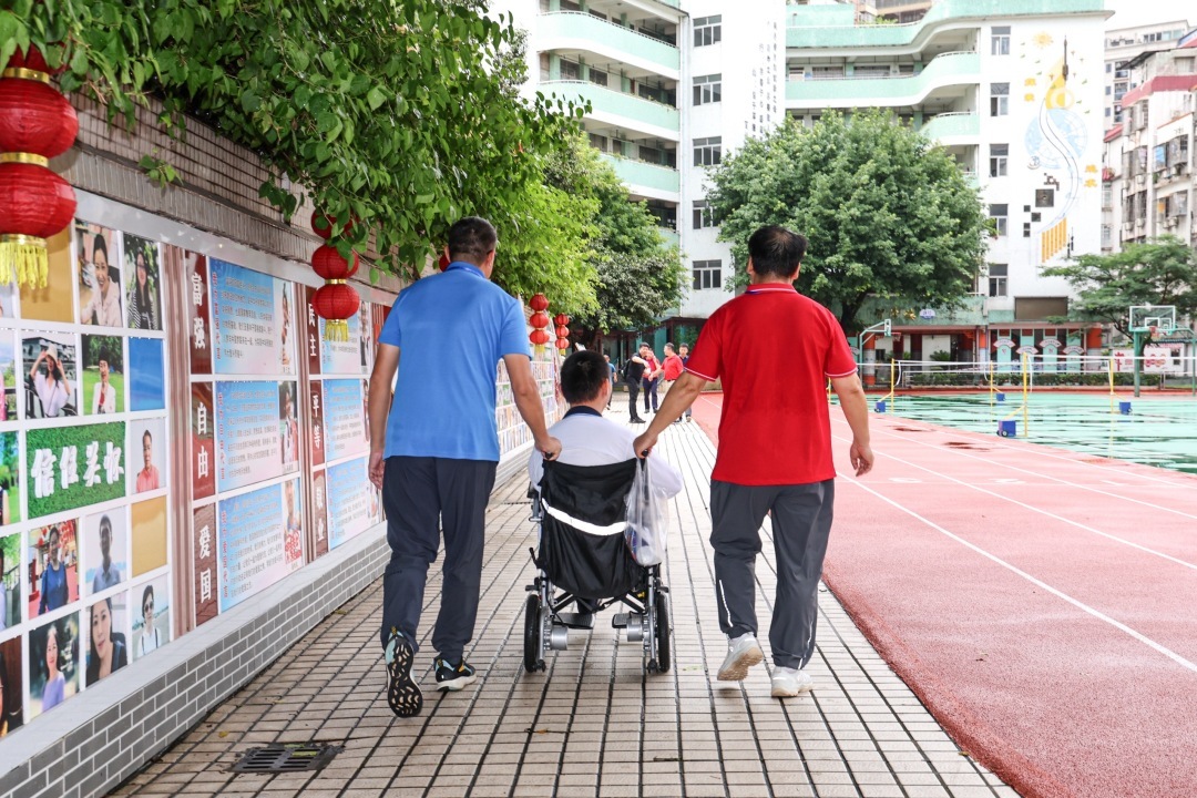 另一名特殊考生郑同学来自广州康复实验学校。郑同学出行需借助轮椅。特殊考生在备用考场考试,该考点设有3个备用考场,均在最低考试楼层二楼。语文科目开考前,考点工作人员先将郑同学推至一楼楼梯口,协助他坐到椅子上,再将他抬上位于二楼的考场。考试结束后,众人协助他下楼,在一楼坐上轮椅后,再陪同他回到校门口。
