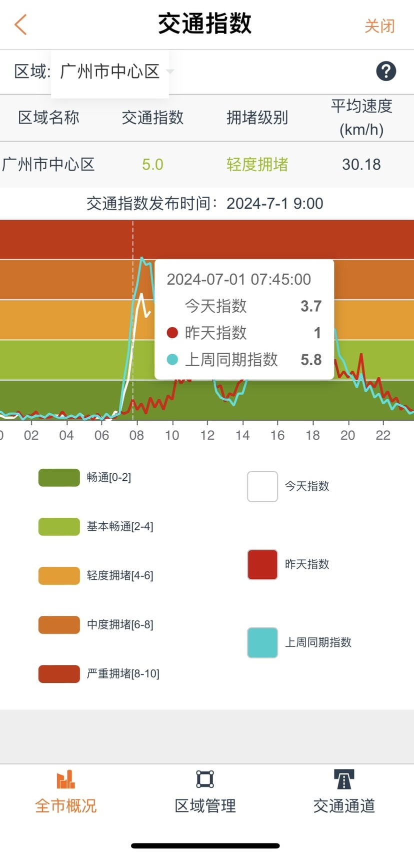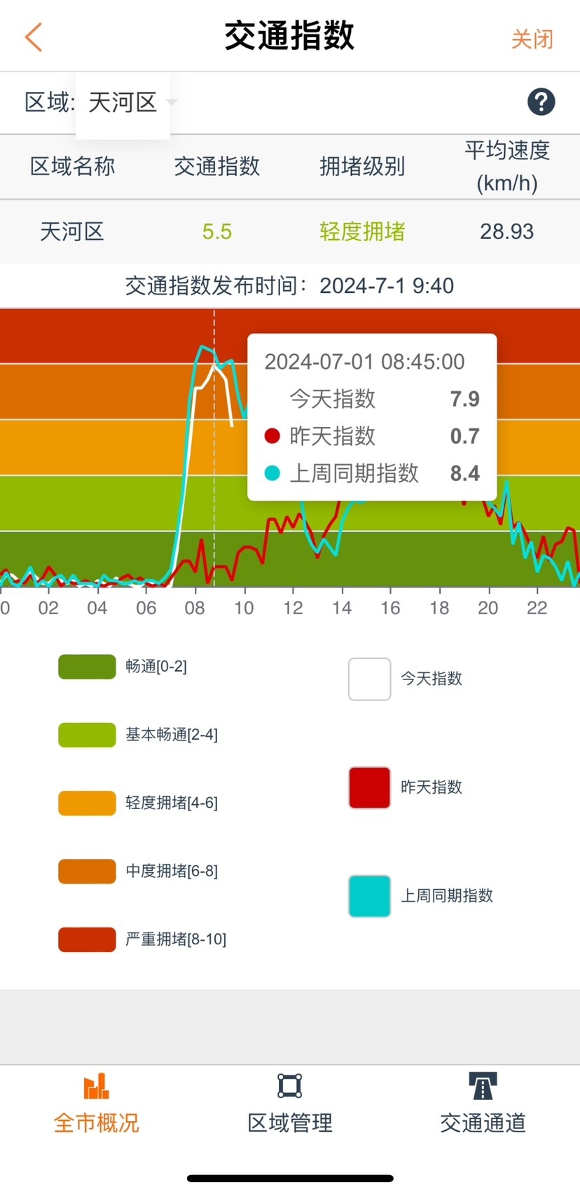 从区域来看,天河区交通指数上周同期最高峰出现在8时15分,为8.6,拥堵级别为严重拥堵;今日8时15分交通指数为7.1,拥堵级别为中度拥堵。越秀区交通指数上周同期最高峰同样在8时15分,为8.8,拥堵级别为严重拥堵;今日指数为7.9,中度拥堵。值得关注的是,今日天河区交通指数最高峰出现后移,出现在8时45分,交通指数为7.9,拥堵级别为中度拥堵。