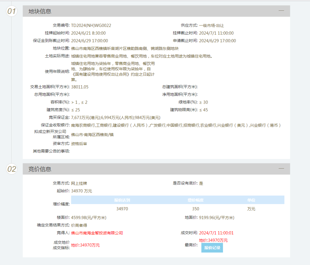7月1日,佛山市南海金智投资有限公司以总价34970万元竞得西樵听音湖超3.8万㎡商住地。这也是西樵住宅土地“断供”5年之后,再次拍出的湖景靓地!