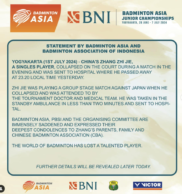 事后,亚洲羽毛球协会及印尼羽毛球协会发出声明,称张志杰在当地时间6月30日23时20分于医院中去世。
