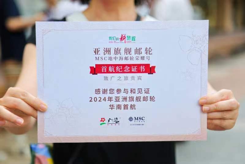 游客王女士向记者展示了由邮轮公司和旅行社共同颁发的首航团证书。她表示,对于本次邮轮之旅她已迫不及待,早已耳闻海上“巨无霸”让人超乎想象的豪华体验,还能参加岸上游,一次旅程就能满足对旅行的多种想象。