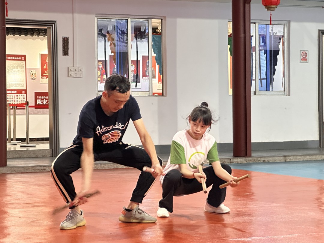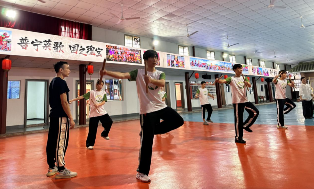 广州体育学院武术学院师生在普宁英歌国家级非遗代表性传承人陈来发的指导下,围绕英歌舞槌、走路槌、打鼓、化妆等专业知识和艺术技能进行学习。