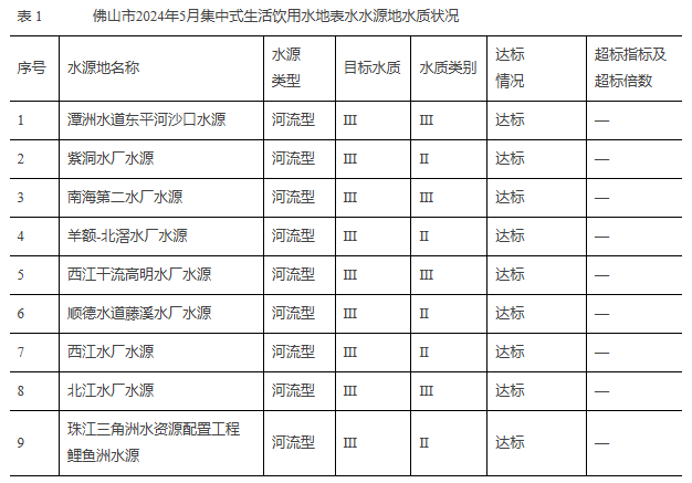 根据评价结果,今年5月,佛山开展监测的9个集中式生活饮用水地表水水源地水质均达到Ⅲ类标准,优于或达到水质目标,达标率100%。