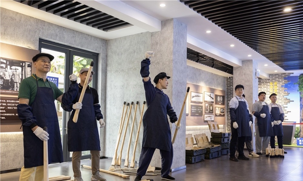“你们3个人今天做木工,你们做通管,你们做手榴弹,你们做组装。”演出从广东兵工总厂红色教育基地的一楼展厅开启,观众在青年演员们的引导下“入戏”,大家系上围裙,戴上工作帽,开始忙活。