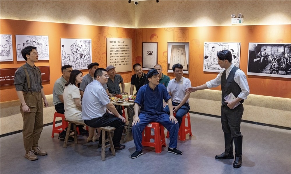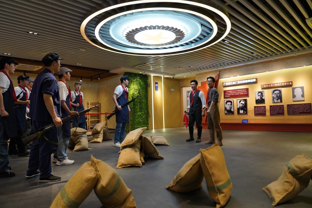 7月1日,在广东兵工总厂红色教育基地,上演了一部以广东兵工总厂为背景的红色主题沉浸式情景剧。在近50分钟的时间里,观众们穿越时空,跟随革命者和“工友”们一起高喊口号、参加罢工游行,深度体验了中国共产党早期的革命活动和工人运动。