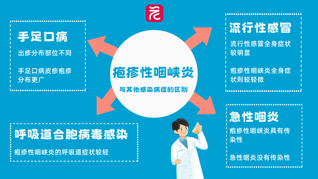 疱疹性咽峡炎与急性咽炎、口腔溃疡有相似之处,但后两者不具传染性。