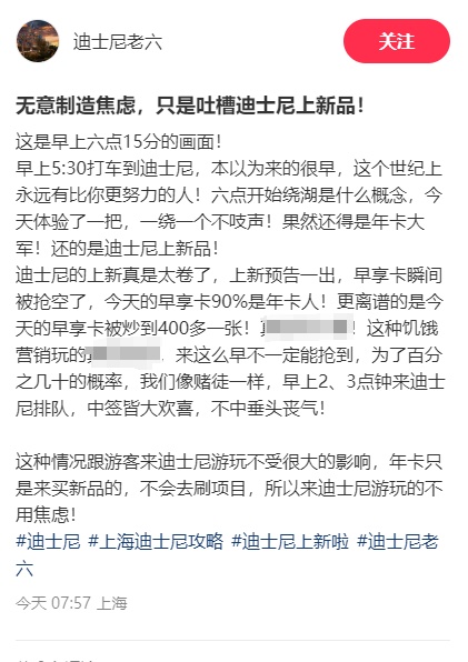 有网友吐槽,迪士尼上新太卷了!自己早上5:30就到迪士尼门口,以为很早,结果六点已经开始排队。早享卡原价169元一张,涨价到400多元一张。