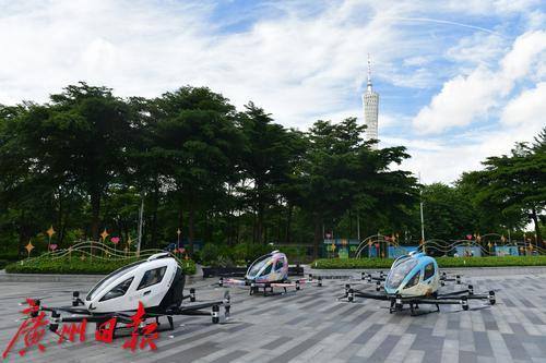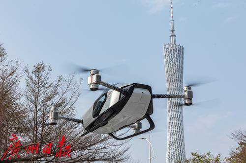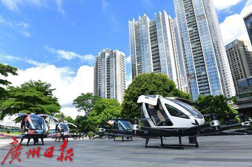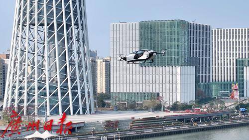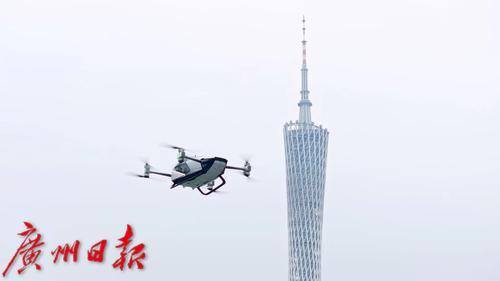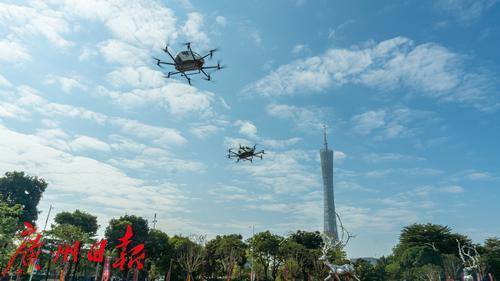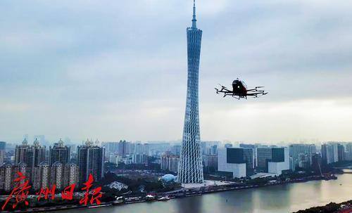 无人驾驶航空器从天德广场起飞在广州CBD飞行。