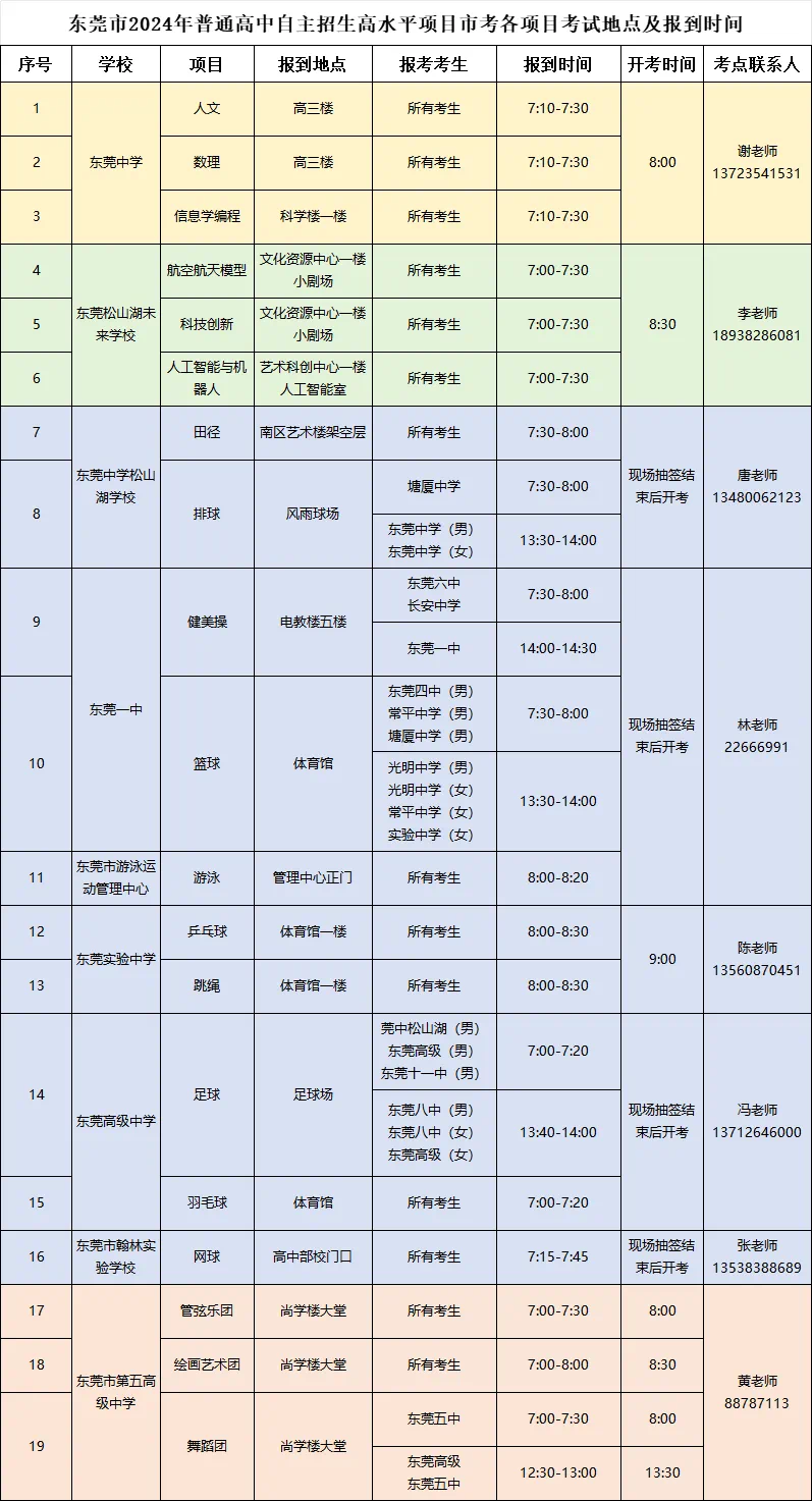 田径、排球、健美操、游泳、篮球、乒乓球、跳绳、足球、羽毛球、网球、绘画、舞蹈需要抽签确定考试顺序,考生须在规定时间内报到,报到时间截止后未到视为放弃考试资格。(例:田径项目报到时间为7:30—8:00,报到截止时间为8:00,8:00未报到视为放弃考试资格)
