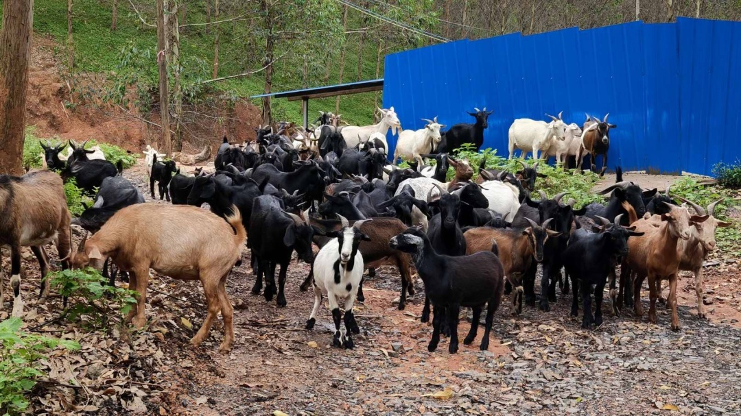 位于河富村的黑山羊养殖场,这里林木葱茏,草地肥沃。当地养殖大户钟华明养殖了上千头黑山羊。羊圈内一只只黑山羊毛色乌黑发亮。