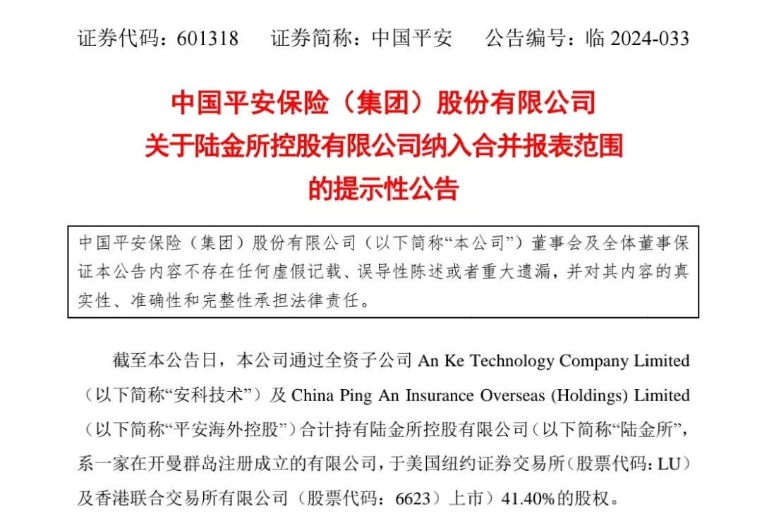 同日,陆金所控股也在港交所发布公告表示,陆金所将成为平安集团的间接非全资子公司,且陆金所集团的财务业绩将并入平安集团的合并财务报表。中国平安无意私有化陆金所控股,且认为不存在私有化陆金所的合理可能性,并有意维持陆金所股份于联交所及陆金所美国存托股份于纽交所的上市。