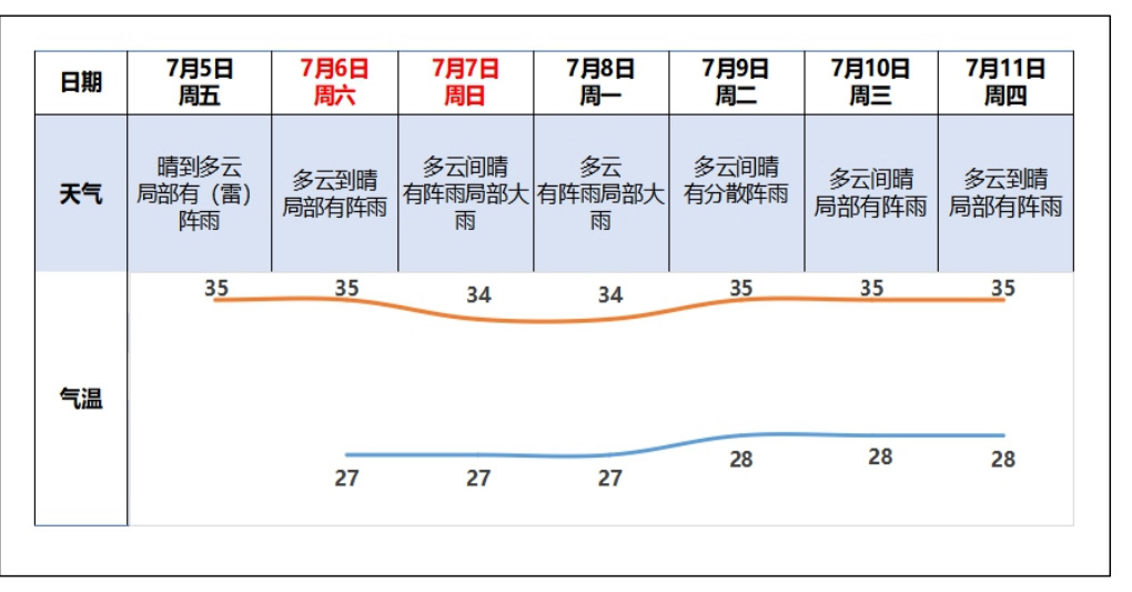 7月5日,广州市三防总指挥部办公室与市气象局、广东省水文局广州水文分局对广州市未来七天的气象水文情况进行了会商。会商意见指出,未来七天,我市受副热带高压控制,以晴到多云为主,天气炎热,局部偶有阵(雷)雨,最高气温35°C左右。