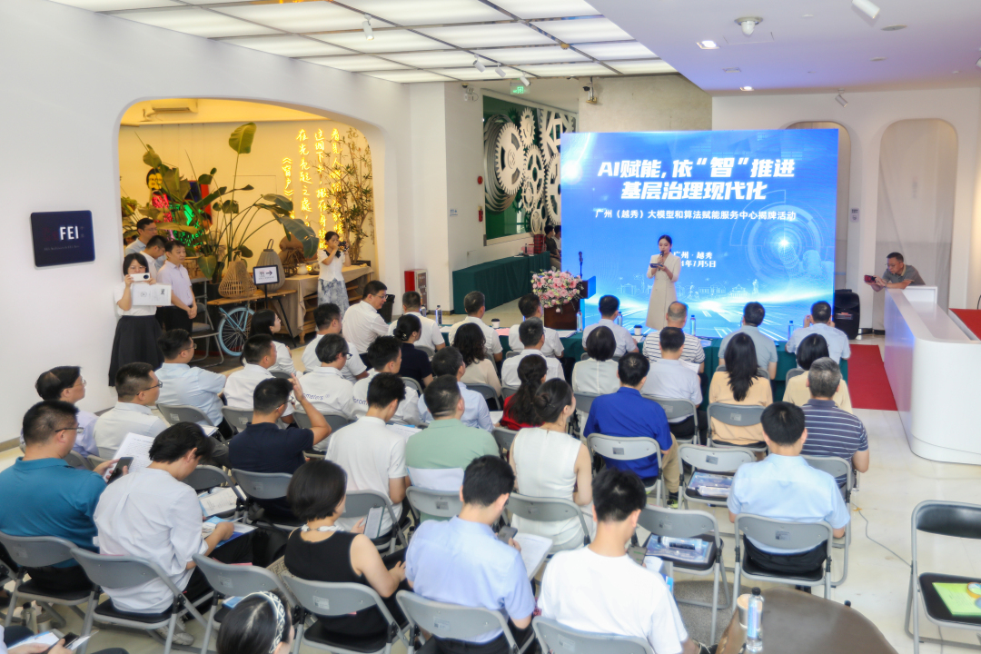 7月5日,广州(越秀)大模型和算法赋能服务中心在越秀区农林街亿达大厦二楼揭牌,省委网信办、市委网信办、越秀区相关部门以及企事业单位相关负责人出席见证。