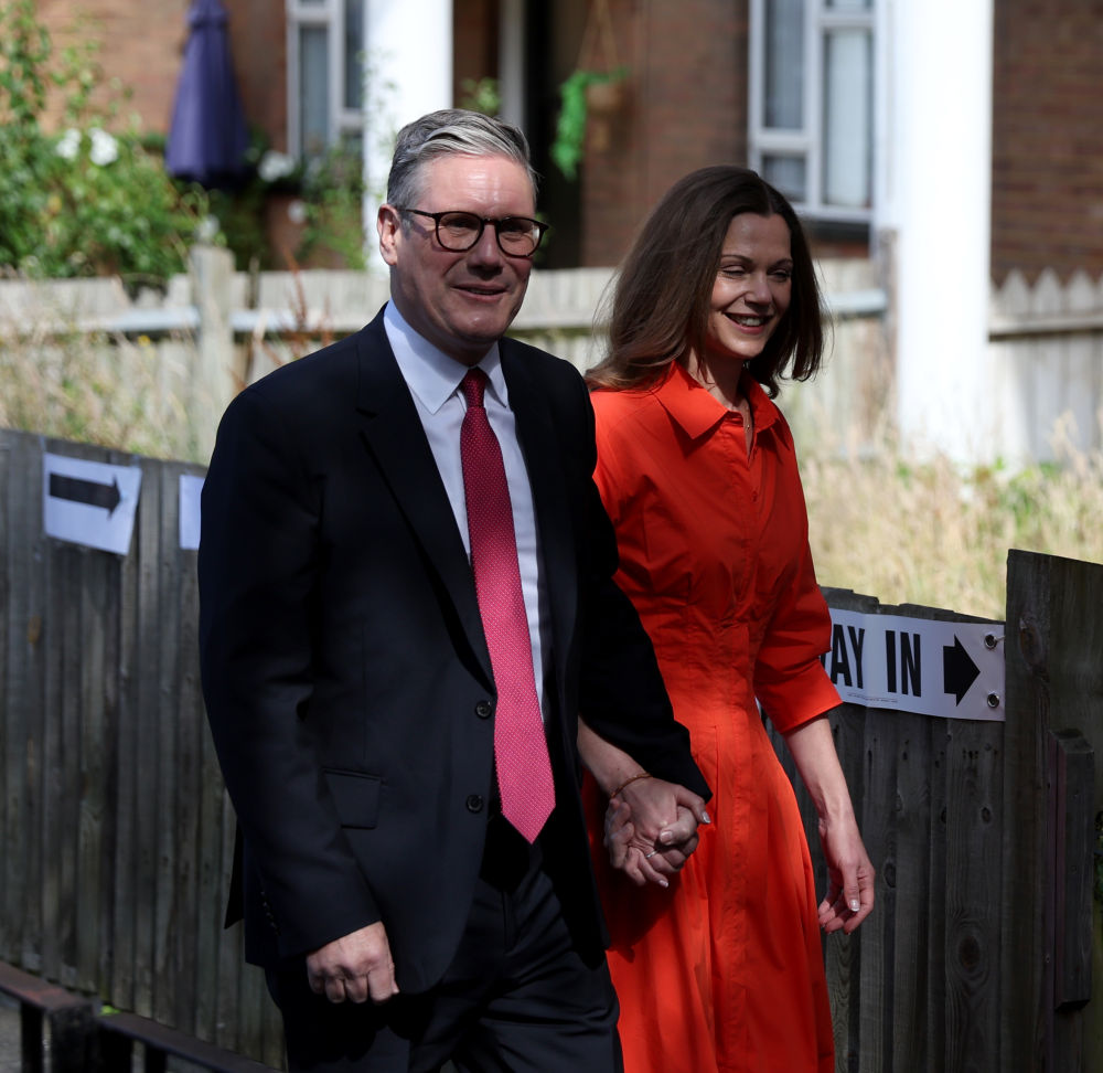 7月4日,在英国伦敦,英国工党领袖基尔·斯塔默(前左)与妻子前往一处投票站,准备投票。新华社记者李颖摄