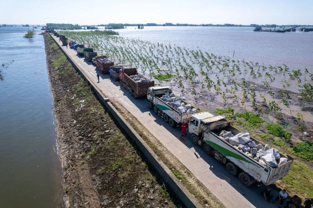 7月6日,湖南省岳阳市华容县团洲垸,装满石块的车辆在决口附近排队(无人机照片)。