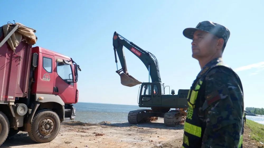 7月6日,湖南省岳阳市华容县团洲垸,装满砂石的车辆驶向决口处进行抢险。