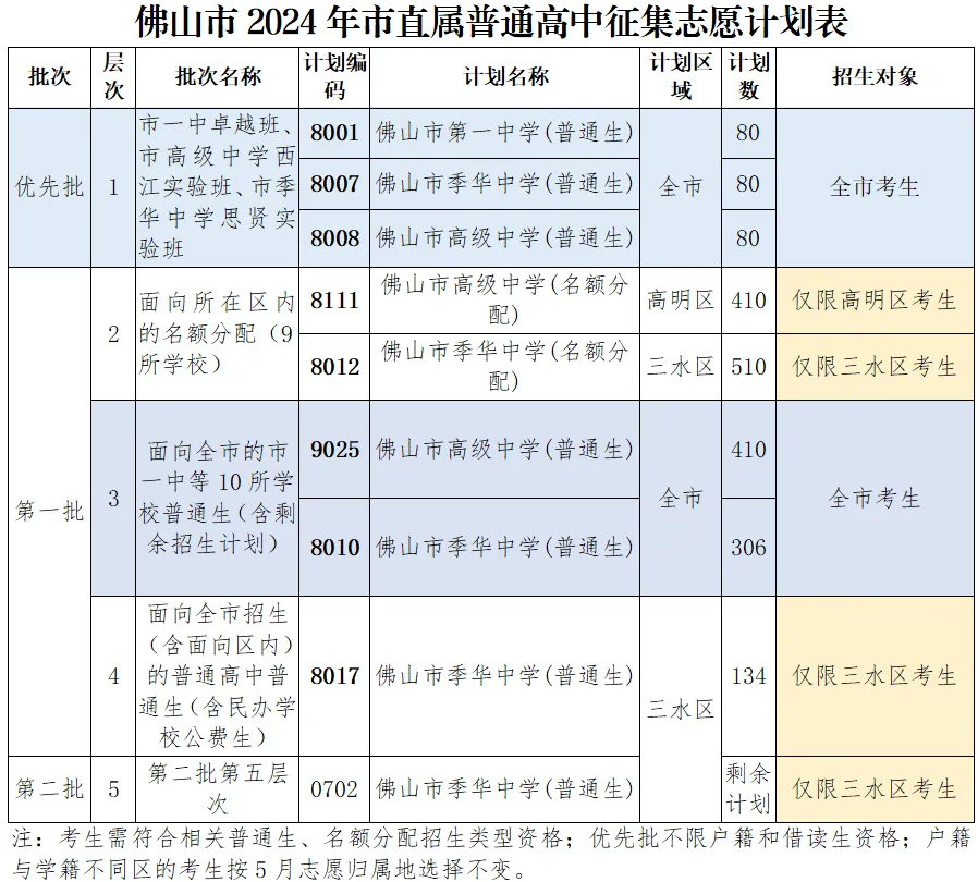 市一中、市高级中学(原高明区第一中学)各招生批次层次和计划数不变。市季华中学名额分配510人仍然面向三水区招生,第一批第3层次普通生306人仍然面向全市招生,第一批第4层次普通生134人和名额分配剩余计划仍然面向三水区招生。普惠生20人面向三水区借读生(省外户籍)招生不变。