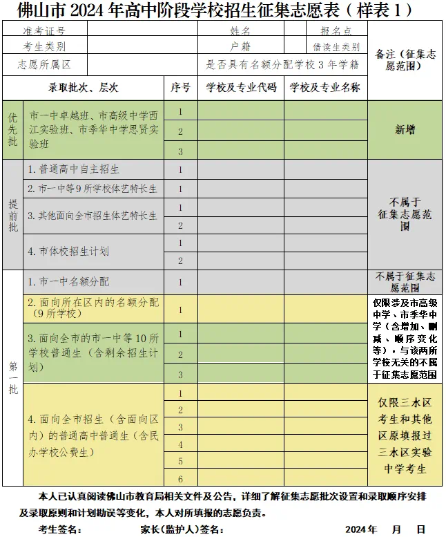 其他批次录取方式仍按原招生方案执行。(注:包括《佛山市2024年高中阶段学校招生考试工作意见》《佛山市教育局关于做好2024年普通高中自主招生工作的通知》《佛山市教育局关于做好佛山市2024年艺术特长生考试招生工作的通知》和《佛山市教育局关于做好佛山市2024年体育特长生考试招生工作的通知》等)