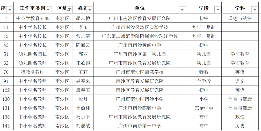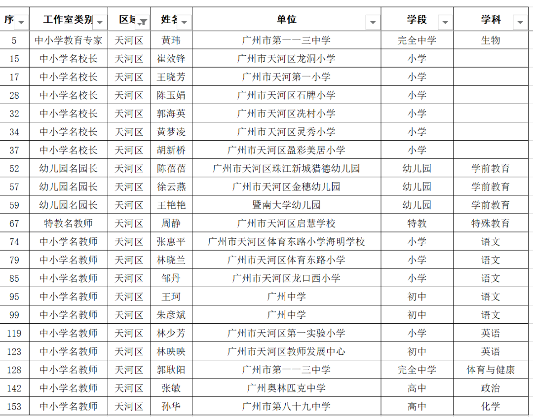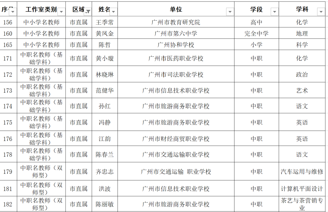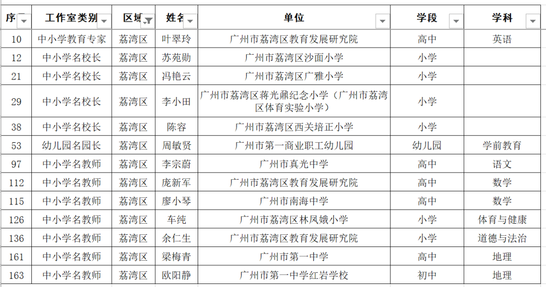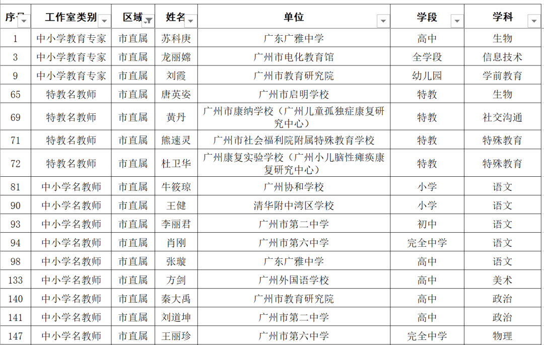名单显示,广东广雅中学苏科庚等10人为教育专家工作室主持人、广州市南沙区湾区实验学校李玉等50人为名校长工作室主持人、广州市启明学校唐英姿等135人为名教师工作室主持人。