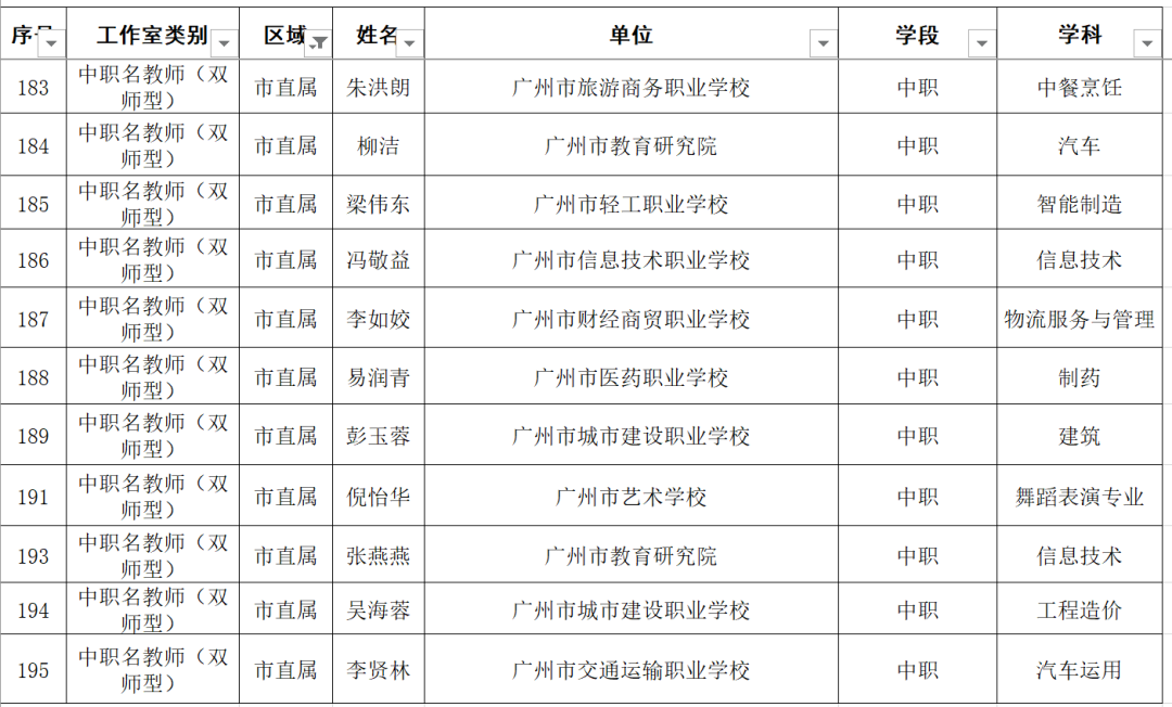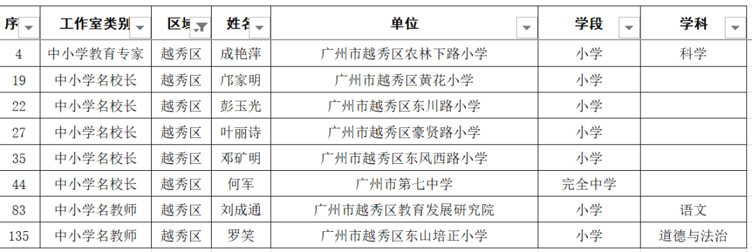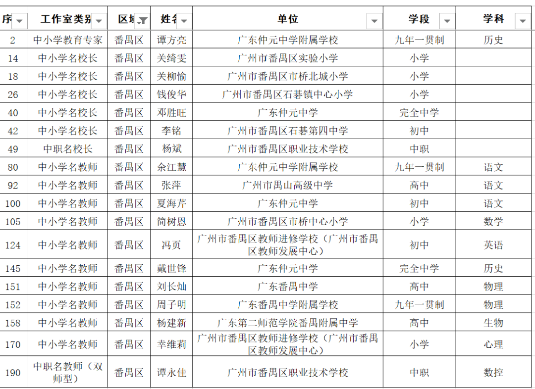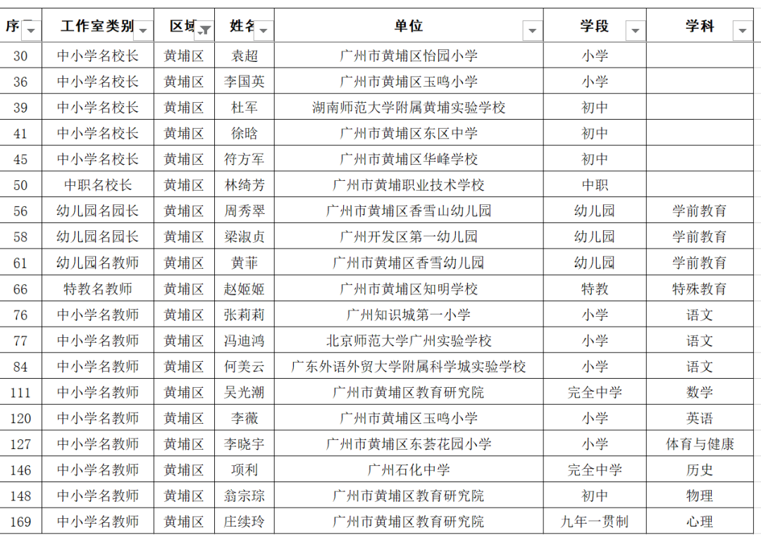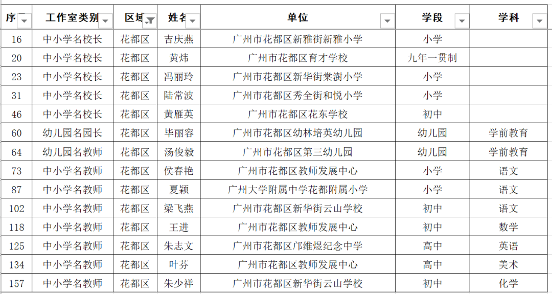 名单显示,广东广雅中学苏科庚等10人为教育专家工作室主持人、广州市南沙区湾区实验学校李玉等50人为名校长工作室主持人、广州市启明学校唐英姿等135人为名教师工作室主持人。