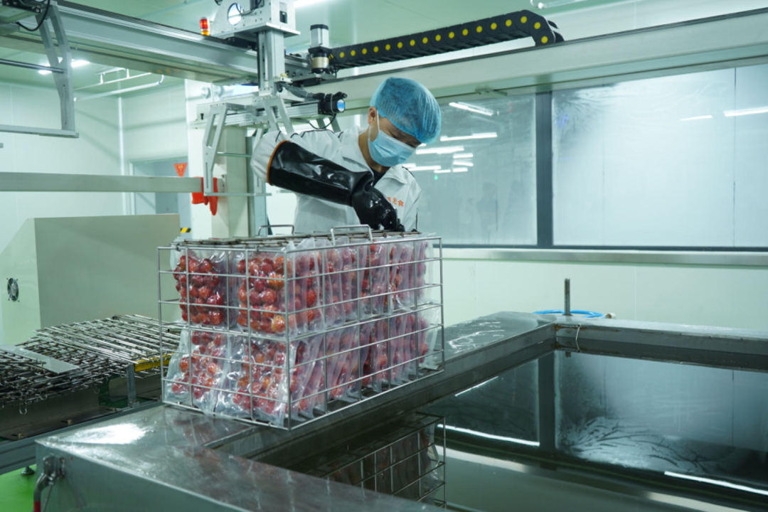 其中,华隆公司就与广东省农业科学院蚕业与农产品加工研究所合作,开发出冻眠荔枝技术。加工研究所负责人介绍,荔枝速冻主要有3条技术路线,一是浸渍速冻,二是液氮速冻,三是传统空气速冻。空气速冻时间久,无法让荔枝快速穿过冰晶层产生温度带,一旦大颗粒的冰晶产生,解冻时就会破坏细胞壁,造成荔枝褐化和出水;液氮冷冻虽然可以实现快速降温,但成本、裂果率都比较高,同样不是产业优选,而使用冷冻液降温,不仅可以节省成本60%以上,包装果的裂果率也比液氮降温降低20%-30%,技术更符合实际。