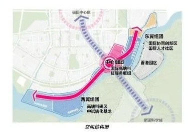 按照图则,河套深圳园区空间布局将立足深圳园区现有口岸设施分布、土地空间条件、区域建设基础,围绕发展目标和任务,主动衔接香港园区空间功能布局、建筑形态,构建“一心两翼”的总体空间格局。中心区域包括福田口岸、皇岗口岸旅检区及周边生活区,规划建设国际高端科技服务枢纽,承担口岸综合服务和高端科技服务功能。西翼包括福田保税区,规划建设高端科研区和中试转化基地。东翼包括皇岗口岸现状货检区及其东北侧生活区,规划建设国际协同创新区和国际人才社区。