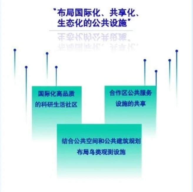 公共设施方面,河套深圳园区将塑造国际化高品质的科研生活社区。科学配置高端人才生活空间,完善服务标准体系,建设多元优质的国际化高品质生活配套设施,构建完善的“15 分钟社区生活圈”;将促进合作区公共服务设施的共享。重点在福田保税区和国际协同创新区规划布局科技展示、会议展览等设施,在东西两翼各规划 1 处临近河岸的会议交流中心,规模可容纳至少 150 人。