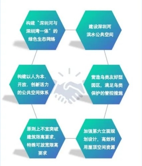 同时构建“深圳河与深圳湾一体”的绿色生态网络。建设由深圳河、广深高速沿线绿化带、新洲河、福田河构成的蓝绿网络,生态化修复滨河岸线,利用广深高速防护绿带建设城市绿道,串联中心公园与深圳湾滨海岸线。 构建以人为本的公共空间体系。积极利用街道界面,布局商业、公共服务设施等开放性功能,塑造具有创新活力的街道空间。