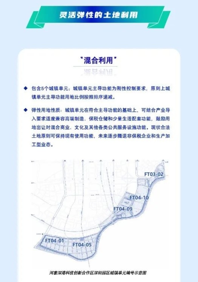 规划范围内建筑立面材料选取还将考虑对鸟类飞行的影响。鼓励设置垂直绿化和屋顶绿化,减少建筑对鸟类造成的影响。鼓励沿深圳河滨水地块裙楼屋顶空间建设共享屋顶,并向公众开放,充分发挥滨河景观价值,为市民提供更多优质开放空间和场所体验;加强第六立面规划设计,高效利用屋顶空间资源,因地制宜布设屋顶绿化、屋顶光伏、屋顶运动场所、低空基础设施等。FT04-10 单元建筑设计在高度、风格、立面材料等方面将加强与香港园区的协调;而规划范围内风貌管控工作将加强,将引入专家评审机制等。