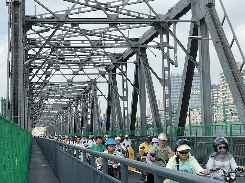 市民骑乘非机动车辆从珠江大桥西桥慢行道过江。