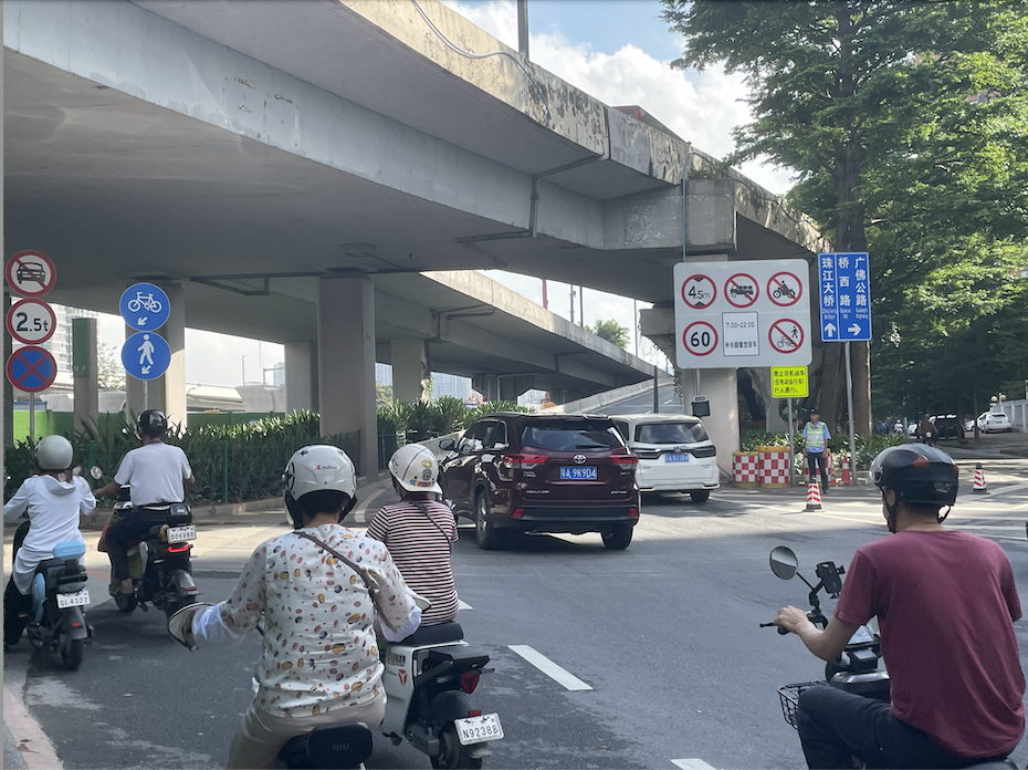 一名交通协管员表示,由于平时早上大多数市民会骑电动自行车前往广州城区上班,早高峰从滘口往中山八路方向的车流量会更大一点,到了晚高峰则迎来“回流”,隔壁车道车流量会更大一点,这是珠江桥这边的交通特色。