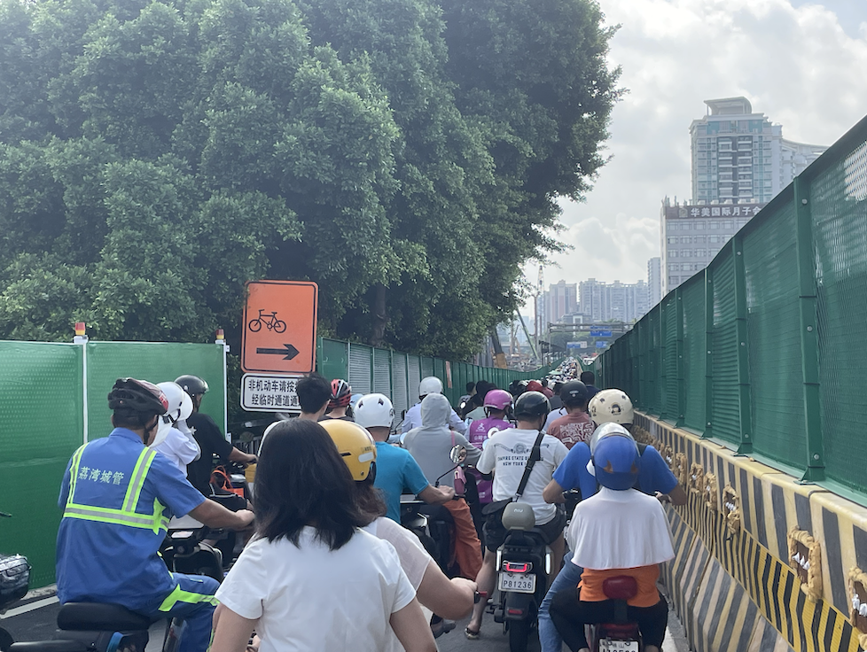 近日,广州珠江大桥西桥慢行道开放使用,原来位于西桥两侧的非机动车道及人行道被围蔽,新的慢行道成了荔湾区滘口附近片区市民电动车过江的主要通道。
