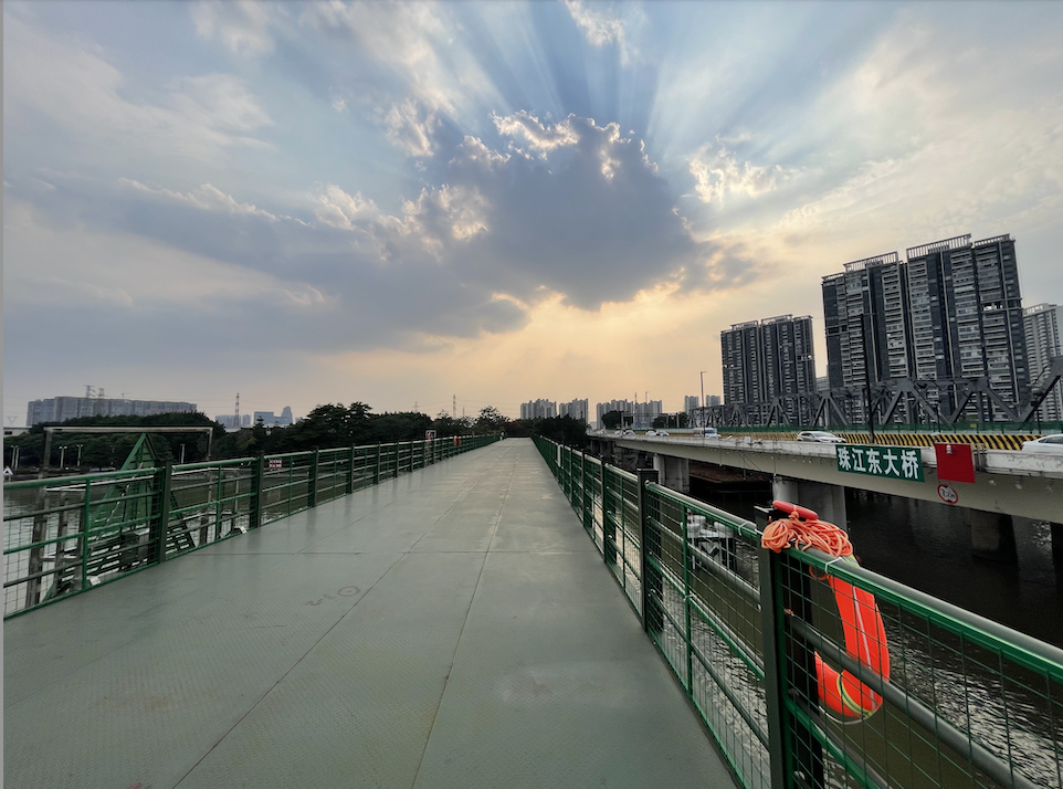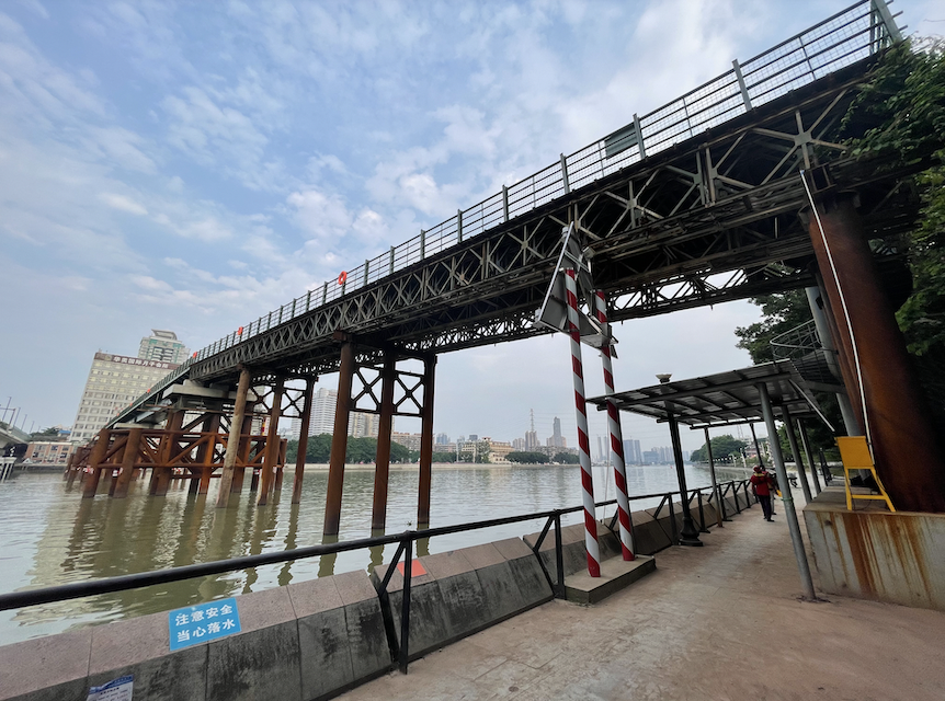 珠江大桥东桥旁边的临时钢栈桥(该桥只供步行使用)。