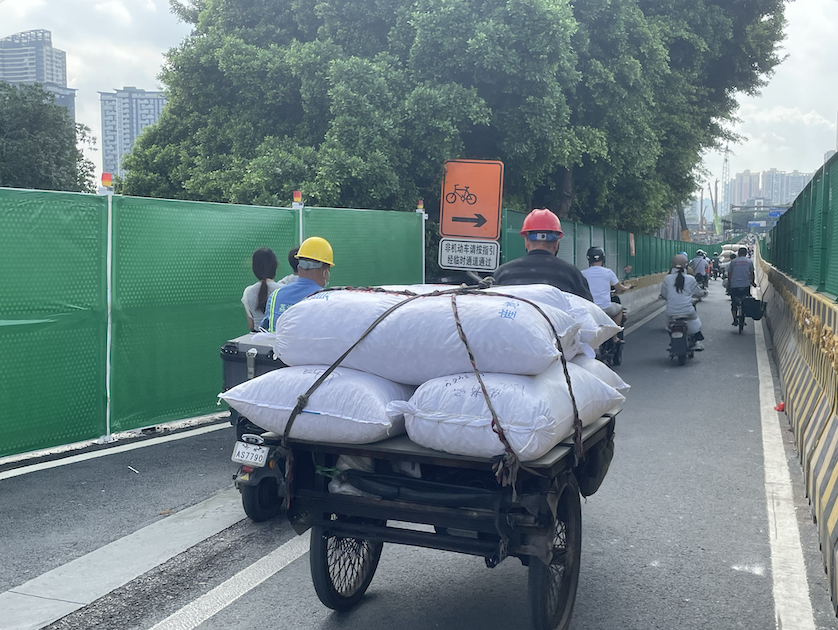 装上货物的电动三轮车在珠江大桥东桥的临时非机动车道通过。