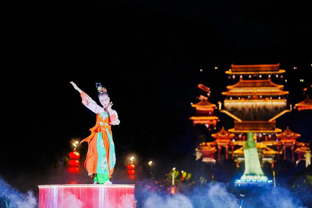 在景区中轴线、牌坊门口,《三太子》《唐印》等舞蹈节目令观众赞不绝口;景区广场上,音乐会火热开唱。