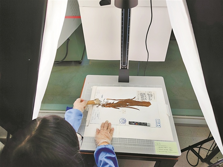华南植物园标本馆,科研人员在给植物标本做数字化录入工作。