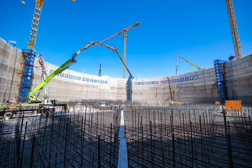 为提升施工质量,一方面,项目建设团队搭建数字化管理平台,自主研发了自动计算加冰水系统,根据实时环境温度、原材温度监测数据,自动控制拌合站加冰和冰水用量,将每一方混凝土入模温度严格控制在28℃以下;另一方面,创新研发大体积混凝土智能温控系统,通过预埋系列测温元器件,自动无线感应温度变化,自动控制循环冷却水的流速和温度,实现了大体积混凝土温度智能反馈控制。