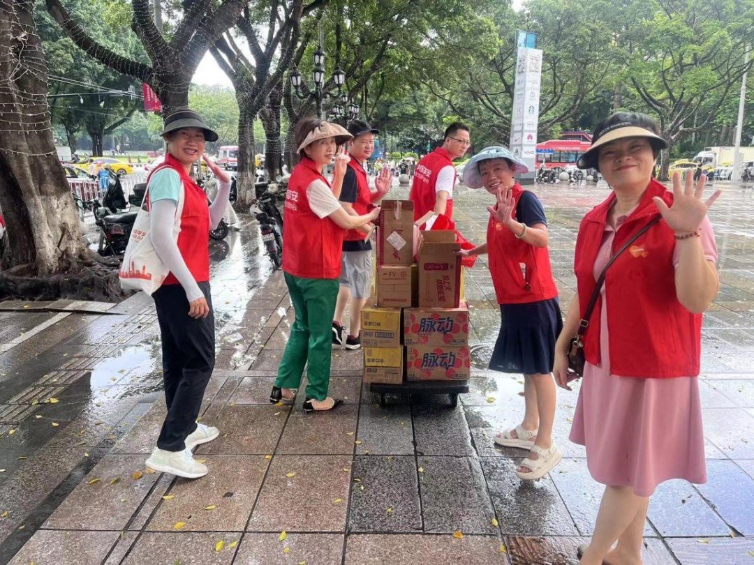 7月2日,一群红马甲在广州的大街小巷中穿梭。在外卖小哥、快递小哥、环卫工人等户外劳动者经常聚集的地方,身着红马甲的平安志愿者们为他们送上了清凉饮品以及热情的夏日问候。
