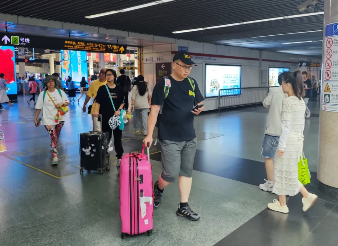 人民广场地铁站到处可见拿着行李的市民游客。“上海交通”微信公众号 图