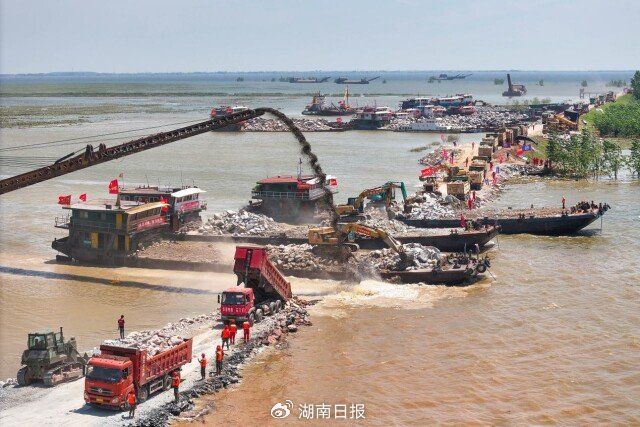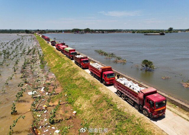 7月6日12时许,华容县团洲垸洞庭湖一线堤防,装满石块的车辆在决口附近排队