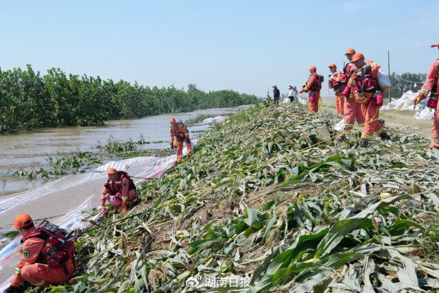 7月7日,常德市增援岳阳华容消防救援力量在距决口处约9公里的钱团间堤铺设彩条布挡水