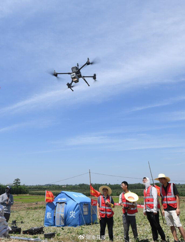 7月7日,华容县钱团间堤上,应急管理部国家自然灾害防治研究院洞庭湖堤防应急智巡先锋队利用多种先进技术装备进行巡堤查险,实现对管涌、渗漏等堤防险情全方位、立体式巡测