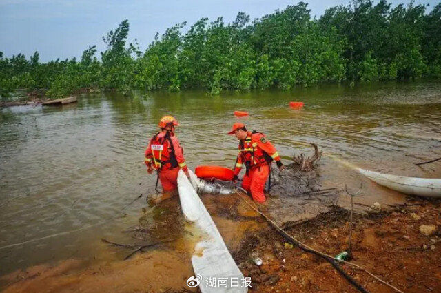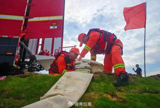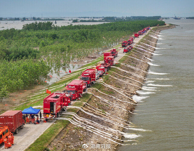 7月9日,华容县洞庭湖一线堤坝,湖南消防救援队伍等排涝专业队在进行抽排积水作业。国家消防救援局调派湖北、重庆、贵州等地消防救援力量实施跨省区增援助力排涝