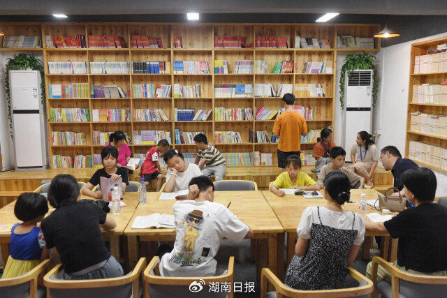 7月8日,华容县实验小学安置点,青少年在家长陪伴下来到校园书屋阅读和自习