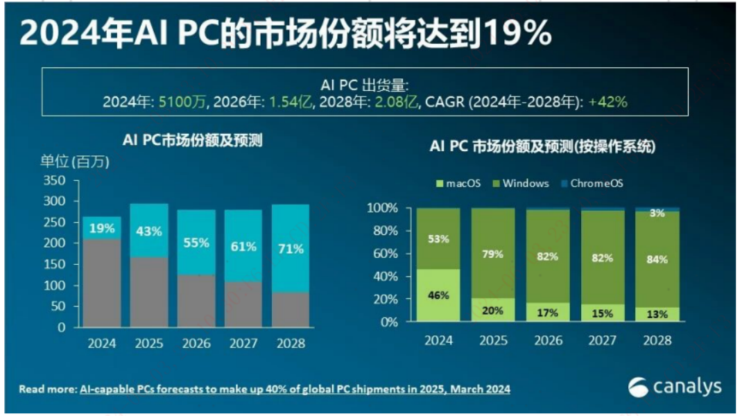 第三方研究机构也对AI PC的增长展望乐观,Canalys预计,2024年AI PC的出货量将达到5100万台,2026年将达到1.54亿台,到2028年有望达到2.08亿台,2024-2028年的五年复合增速将达到42%,将为AI产业成长提供重要动力。