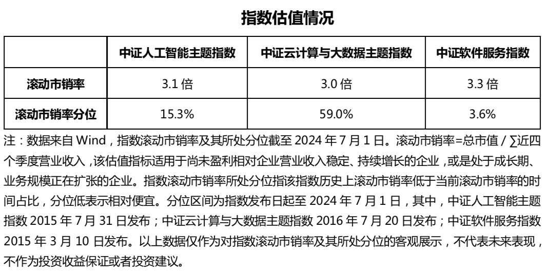 截至7月1日,中证人工智能指数滚动市销率为3.1倍,处于指数发布以来15.3%分位数;中证云计算与大数据主题指数滚动市销率为3.0倍,处于指数发布以来59.0%分位数;中证软件服务指数滚动市销率为3.3倍,处于指数发布以来3.6%分位数。